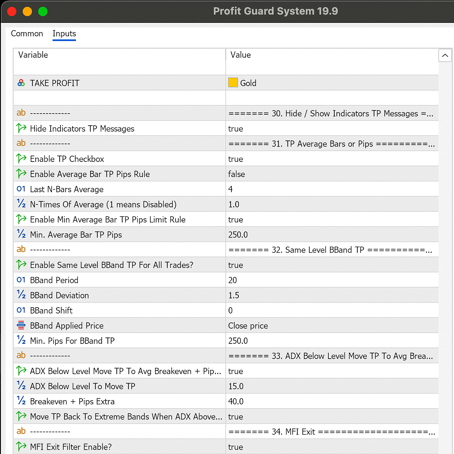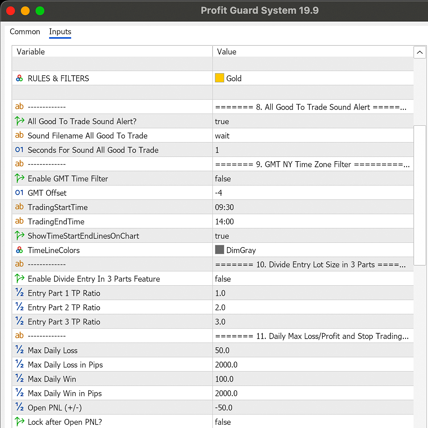 3. Input Settings – A full customization window with over 50 adjustable features that let you activate indicators, rules, and protections that match your strategy — or use the optimized default setup ready to trade.