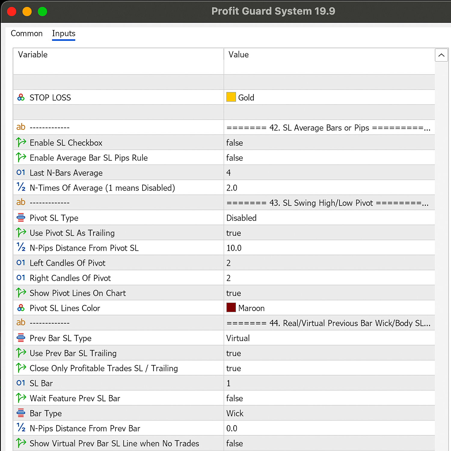 | 47 | Previous Bar Min. Profit Distance | Sets minimum distance for SL when trade is in profit. |