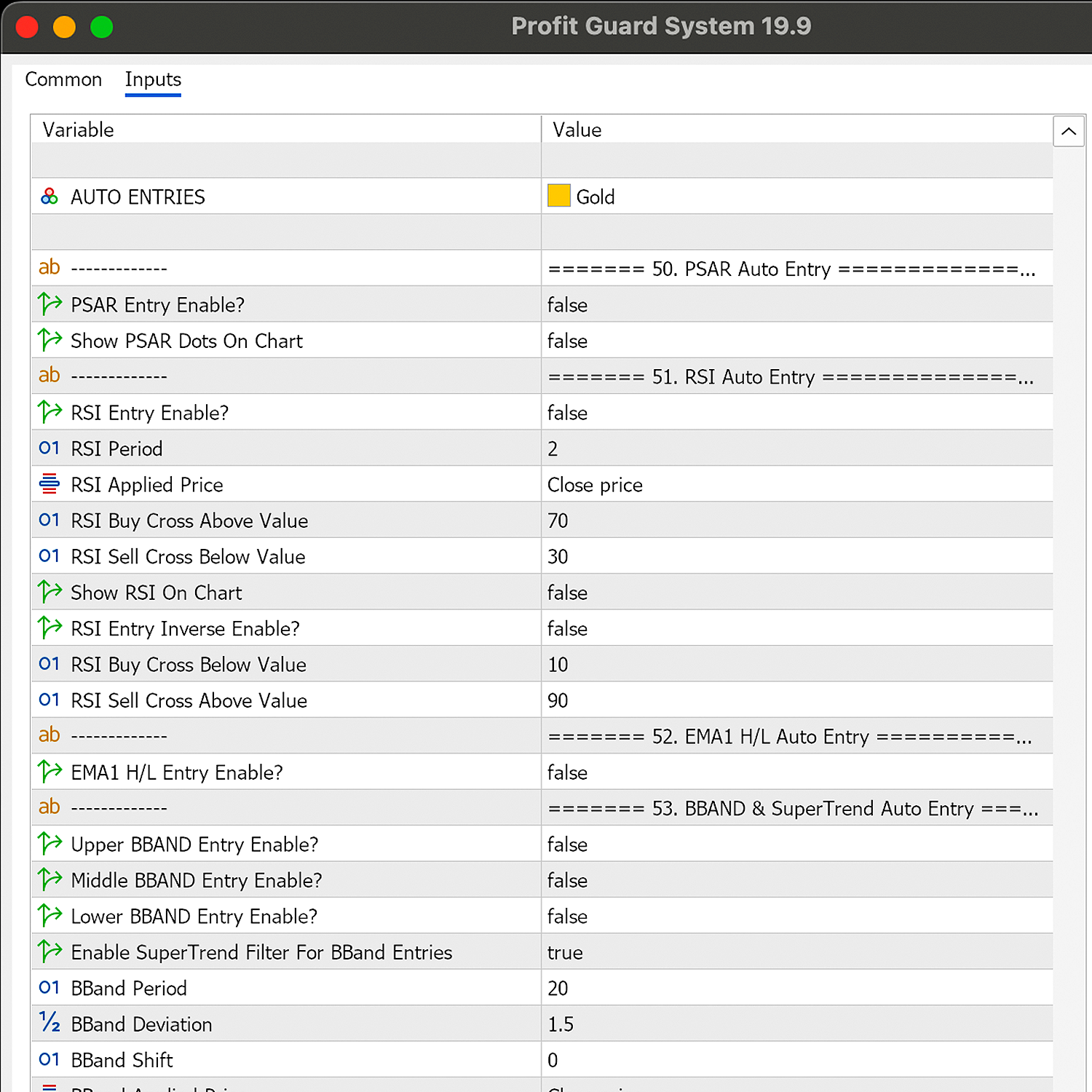 | 50 | PSAR Auto Entries | Opens trades automatically when Parabolic SAR flips direction. |